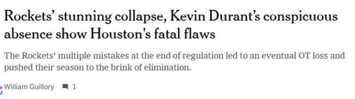 北京时间4月25日,火箭队记William Guillory报道了球队输掉G3后的一些情况,包括乌度卡的更衣室训话,杜兰特全程消失引起的热议。以下是相关内容——