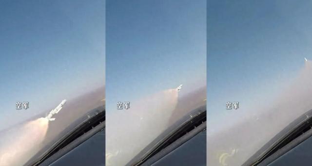 与055大驱同框合影同样让人印象深刻的,还有歼-20隐身战斗机发射霹雳-10近距格斗导弹,并完成越肩攻击的画面。