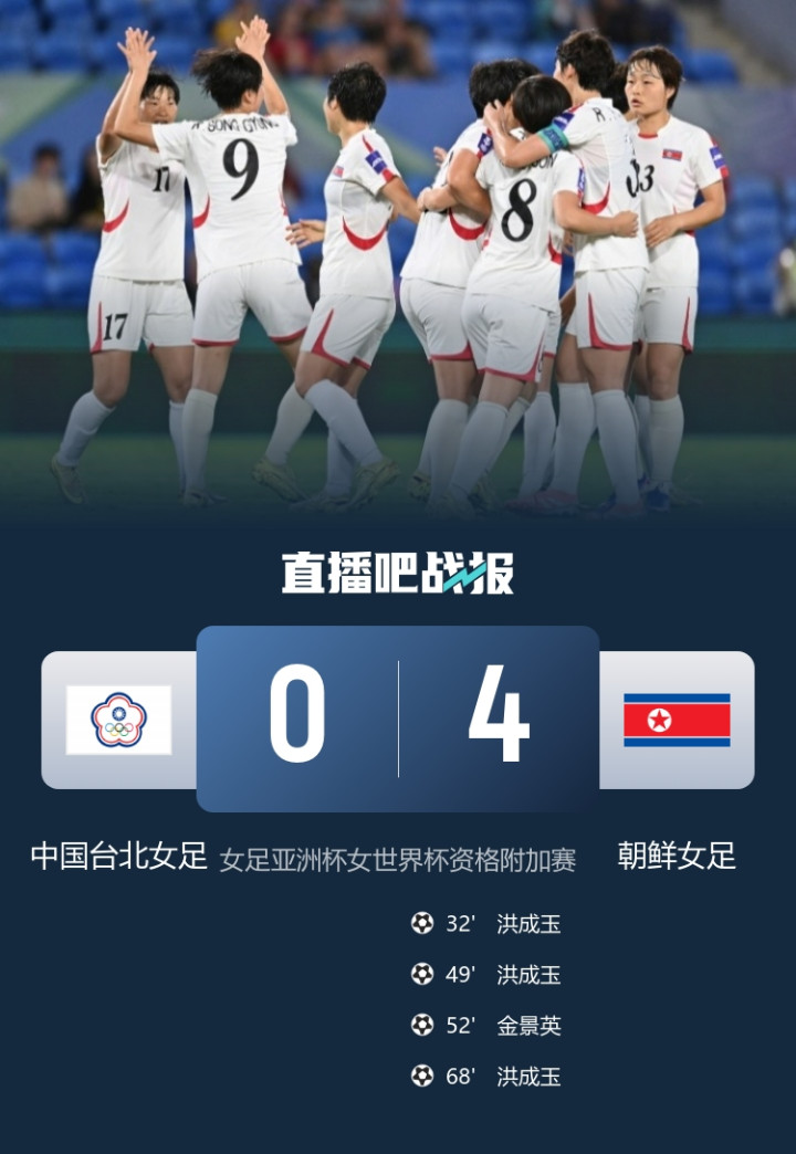 直播吧03月19日讯北京时间3月19日下午17:00,女足亚洲杯女世界杯资格赛附加赛,中国台北女足对阵朝鲜女足。上半场,洪成玉头球抢点破门,下半场,金景英门前头球破门,洪成玉再进两球,完成帽子戏法。全场结束,朝鲜女足4-0中国台北女足。本场过后,朝鲜女足拿到了直通2027女足世界杯的资格,中国台北女足将踢世界杯洲际附加赛。